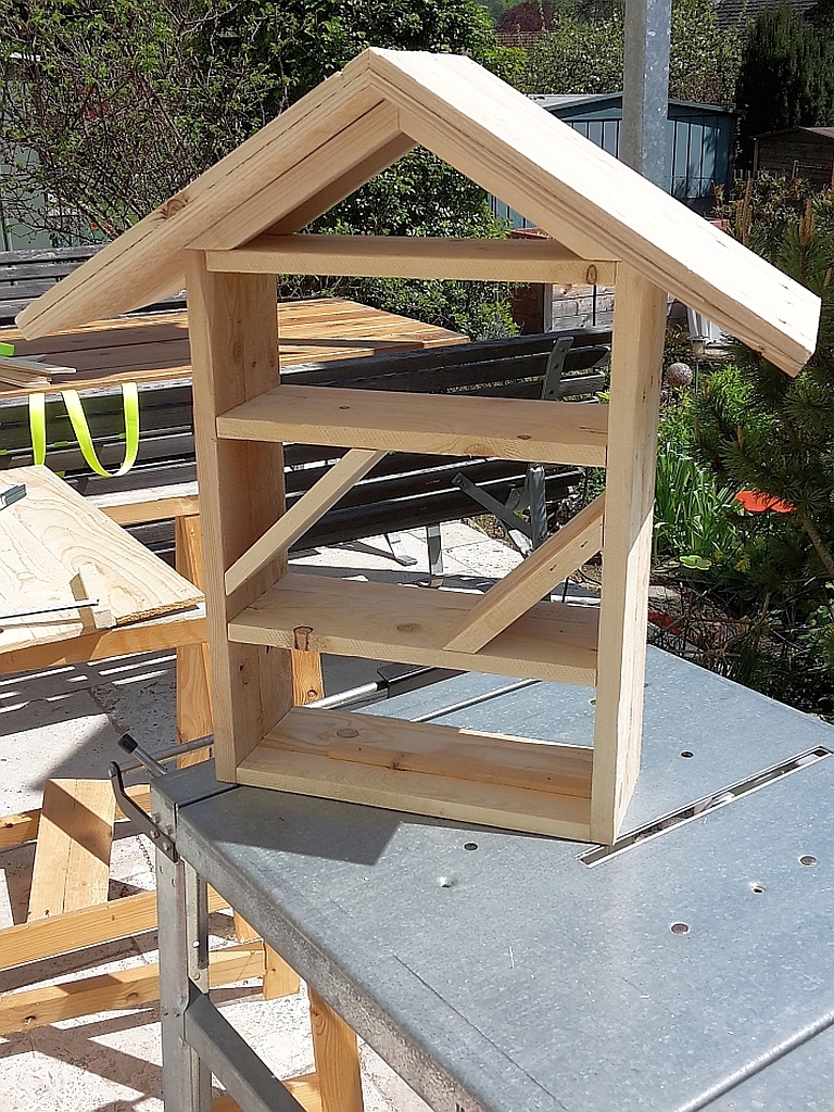 Das Dach ist gedeckt mit Bitumenschindeln, die aus einer Villas Dachbahnrolle geschnitten sind, die Rückwand ist aus Resten von Feder-Nut-Brettern gefertigt.