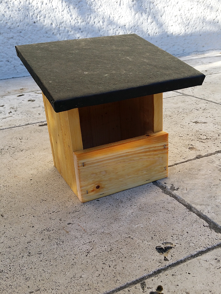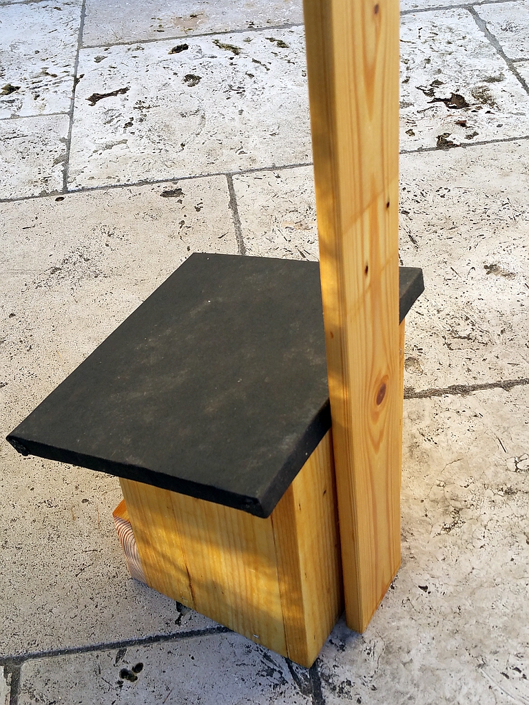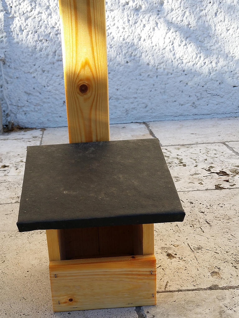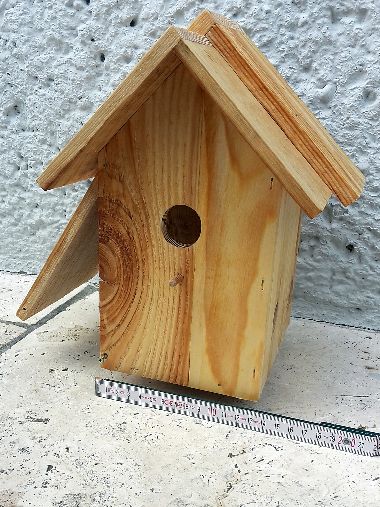 Die Abmessungen vom Nistkasten sind 15,5x15,5x21,5 (LxBxH), über das Dach 19x21, die Wandstärke ist 17 mm. Das Montagebrett ist noch nicht fixiert, kann nach Bedarf gekürzt und angeschraubt werden.