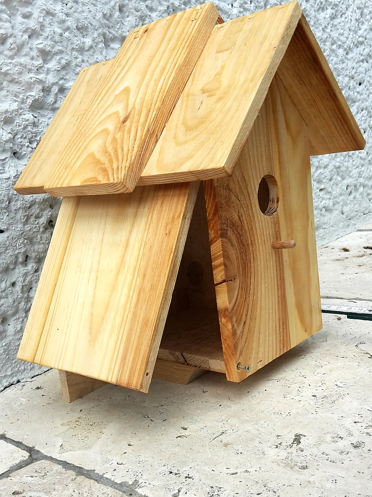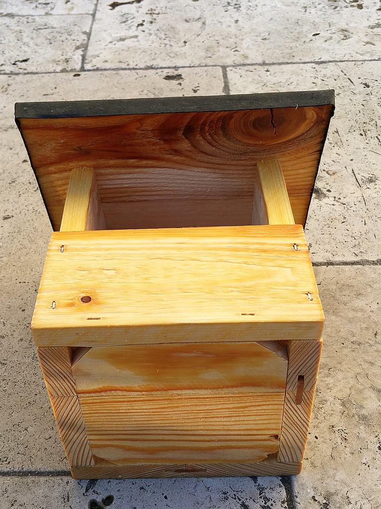 Gebaut habe ich dieses Nistkästchen aus Brettern von Einweg-Paletten, die ich in meiner Umgebung günstig bekommen habe, die einzelnen Bretter sind "gefischerlt" und verleimt. Für Reinigungszwecke ist die linke Seitenwand zum Öffnen, oben drehbar und unten mit 2 Schrauben fixiert.